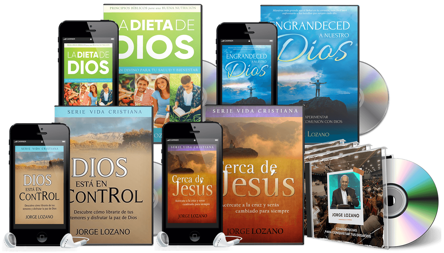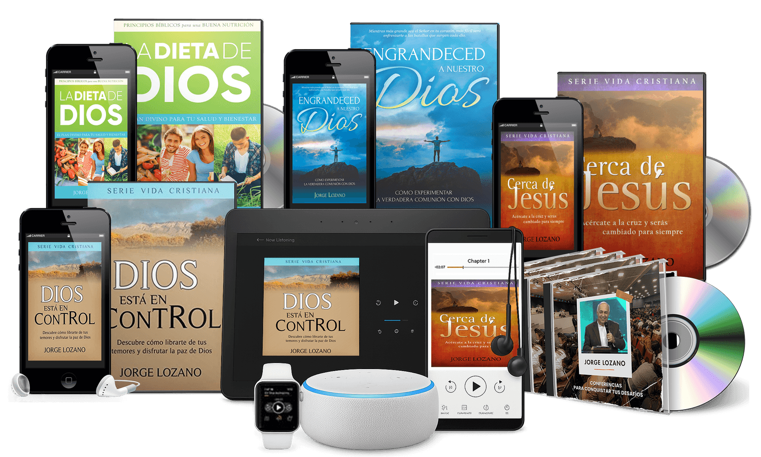 El audiolibro "Dios está en control" tiene una duración de 2 horas y 8 minutos, el audiolibro "Cerca de Jesús", 3 horas y 11 minutos, "La Dieta de Dios", 3 horas y 23 minutos, y "Engrandeced a Nuestro Dios" tiene una duración de 3 horas y 38 minutos.